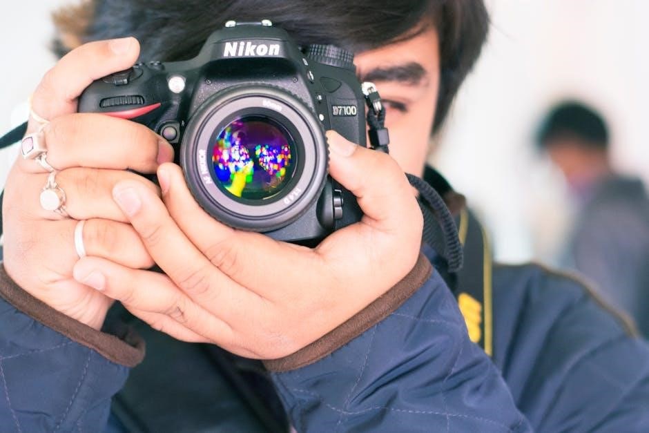 A wider aperture (smaller f-number like f/2.8) creates a shallow depth of field‚ ideal for isolating subjects with blurred backgrounds. Conversely‚ a narrower aperture (larger f-number like f/16) yields greater depth of field‚ keeping more of the scene sharp. Always observe the shutter speed displayed in the viewfinder to avoid motion blur.